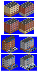RE: Projekt polskie budynki - Sojita - 07-11-2016 świetne te grafiki! Ale rysując coś polecałbym jeszcze dorysowanie kratki/kratek z podłożem na których budynek będzie stał. A jeśli to budynek który ma powstać w czasie gry a nie być wygenerowany wraz z mapą jak starówki/rynki to powinien mieć też 3 (dobrze pamiętam że 3?) fazy budowania. Wtedy będzie wystarczyło go zakodować. Co do placyków, placów zabaw itd przy blokowiskach i innych obiektach mających dodać przestrzeń nie myślałem by je zrobić jako inny budynek a alternatywny wygląd bloku tak że bloki danego typu będące obok siebie przyjmowały by wygląd ładnego blokowiska na podobnej zasadzie na której starówka łączy się w ładną całość a szerokie bloki w jeden długi. Ale prócz problemu z ciasnotą jak zauważono wcześniej brakuje budynków w stylu socrealistycznym budowanych w latach 50, tak że od razu z dawnych kamienic wyrastają PRLowskie wielkopłytywce. A co do domów w "erze współczesnej" można przecież zrobić że kolor ich dachu/ścian nie jest sztywno ustawiony a wybierany losowo tak jak ma to miejsce przy "typowym biurowcu PRL Można to też zastosować by urozmaicić kolory dachów kamienic itp.