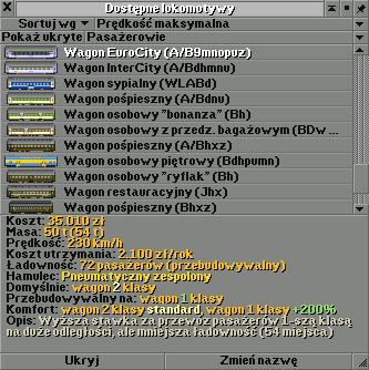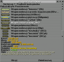 RE: Polish PKP Set v2.0 - Walter Novotny - 02-12-2015 (01-12-2015, 23:42)TadeuszD napisał(a): ...Teraz będzie można tworzyć realistyczne składy, takie jak na zestawieniach. Czy dobrze rozumiem opis? Ten wagon restauracyjny daje bonus we wszystkich wagonach? Czy może we wszystkich dalekobieżnych czy tylko w ekspresowych? Jak w OpenTTD wyglądają te bonusy? One są stałą wartością np +50? Czy stałym procentem np +50%? RE: Polish PKP Set v2.0 - 101ksl - 02-12-2015 Cholera, ale mam satysfakcję... Dzięki, @Tadeusz, naprawdę bardzo się cieszę, że mogę pomóc w tworzeniu tak wspaniałego dodatku.One more thing: Gdzieś daleko, daleko, na początku wątku napisałeś, że nie da się zrobić równych prędkości (np. 100km/h dla Gagara i 110 dla EN57). Ale w CSD Set są pociągi, które mają idealnie taką prędkość. Niby nic, szczegół, ale kibel jadący 111 km/h to chyba trochę niebezpieczne dla pasażerów