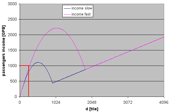 No i pisałem - te "nieproporcjonalnie duże przychody" nie są żadnym problemem. Wręcz też są OK. Jeśli taki gigantyczny przychód, uzyskany za przewóz na odległość 4k kratek (wierzchołek granatowego wykresu) podzielisz przez czas, który trwał ten przewóz, to wcale nie wyjdzie tak dużo. Podobny, a nawet większy przychód jest w stanie 'wyjeździć' pociąg na krótszej trasie (początek wykresu), ale pokonując tę trasę wielokrotnie w tym samym czasie...