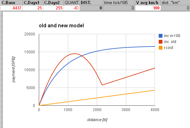 Stary model pozwala na absurdy typu b. duży zarobek na b. dużych odległościach z b. małą prędkością, bo przychody są liniowe.