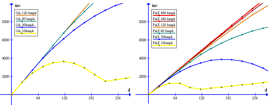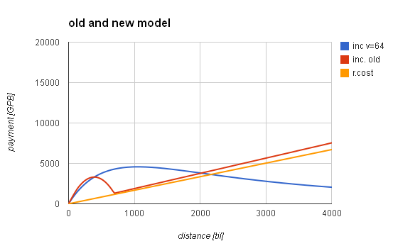 Przy mapach 256x256 działało to prawidłowo, ale przy większych mapach nawet przy dużej prędkości opłata za transport spada szybciej niż przyrasta dystans (po prostu z funkcji rosnącej robi się parabola), aby nie było ujemnych opłat, ktoś dosztukował linię prostą.