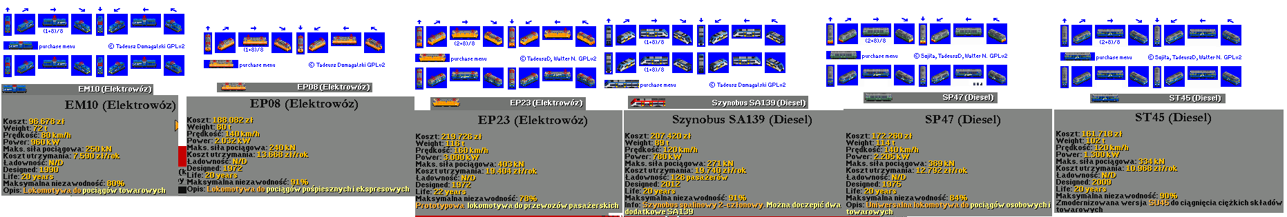 Na wstępie napisze że wszystkie grafiki były bazowane na czyiś, nie wiem czy mogę je nawet pokazać, gdyż robiłem je tylko pod własny grf (dodałem sobie po wielu próbach i błędach do setu. Nie, nigdzie nie udostępniam go bo same "repainty" są tragiczne). Dodałem 7 lokomotyw: